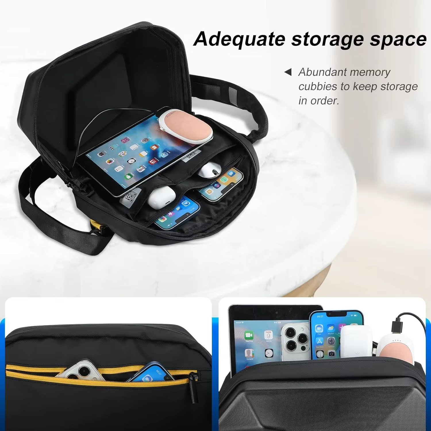 - Spacious & Organized Storage : Multiple compartments for phone, tablet, power bank, and accessories